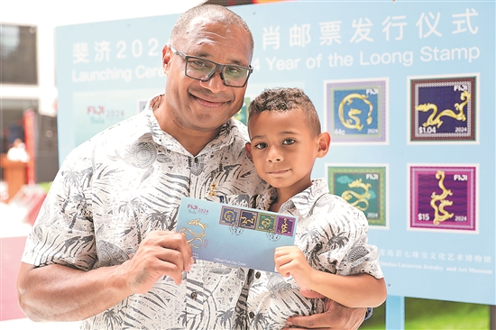 当地时间2月3日,在斐济举行的中国农历龙年生肖邮票及首日封发行仪式上,一对父子展示中国农历龙年生肖邮票及首日封。