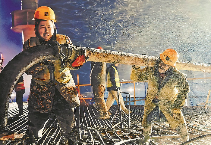 2月3日晚,南方小年夜。泥工张久云(左前)、张胜波(右前)正和班组其他工友连夜进行泵管拼装。
