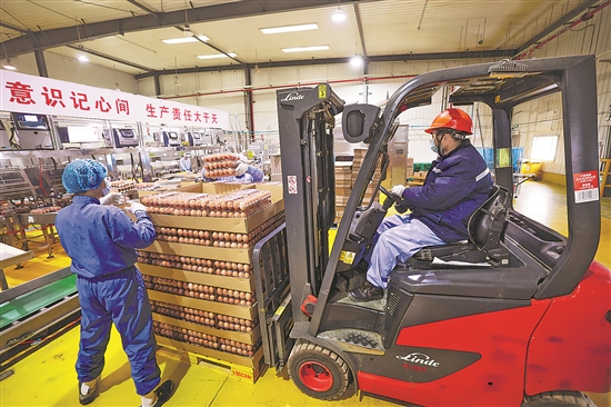 2月5日,在慈溪正大蛋业有限公司的车间内,工人把当天产的新鲜鸡蛋分类装箱,准备运往外地商超市场。