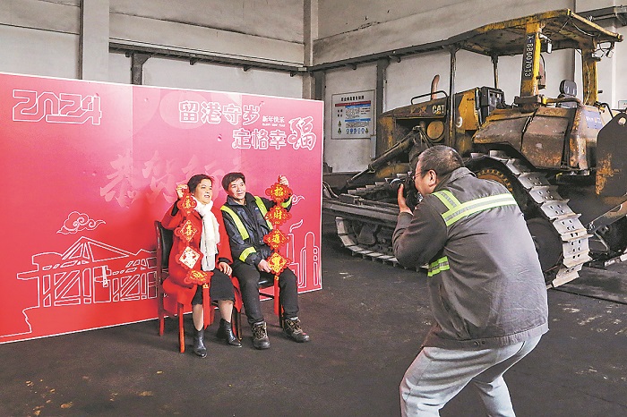 1月31日,吴水花穿上新买的大红衣服坐上了开往宁波舟山港股份有限公司北仑矿石码头分公司宁钢码头的专车。她丈夫陈必生是该码头装卸工,这天公司举办“留港守岁,定格幸福”活动,为春节留守的职工拍摄全家福。蒋晓东 宋子琦 摄