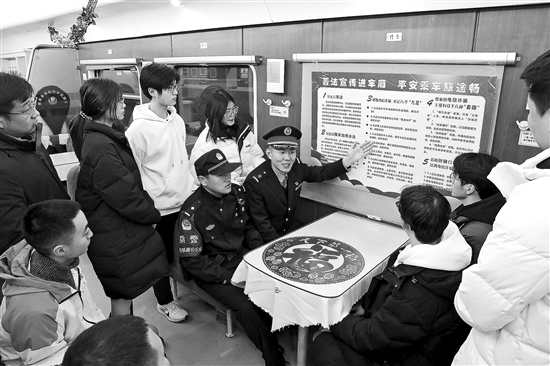 为提高春运出行旅客电诈防范意识,减少上当受骗的问题发生,中国铁路济南局集团有限公司济南客运段连续第四年推出“法治宣传进车厢”活动,将电诈特点、套路制作成宣传展板,向旅客进行广泛宣传。图为1月15日,在济南开往乌鲁木齐的Z105次列车上,列车长向旅客进行宣传讲解。