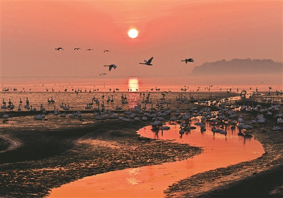 1月30日,山东省荣成市大天鹅国家级自然保护区湿地,成群大天鹅在朝阳下嬉戏、飞舞。杨志礼 摄/中新社