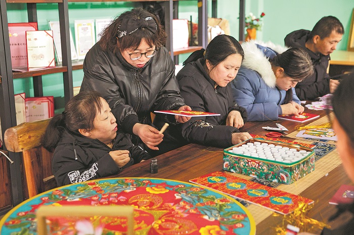 近日,内蒙古自治区呼和浩特市新城区乌兰不浪村的“牧勒工坊”内,残疾人正在掐丝珐琅技艺传承人崔霞(主图左二)的指导下制作掐丝工艺品。