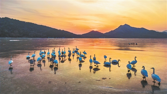 近日,西伯利亚远途而来的白天鹅栖息在北京怀柔水库,夕阳下形成一道美丽的风景线。孙永东 摄/视觉中国