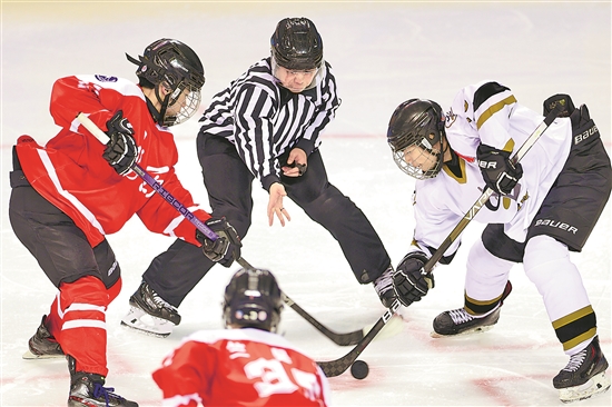 2月18日,第十四届全国冬季运动会冰球项目青年男子组比赛开赛,陕西队7:2战胜四川队。 本报记者 蔚可任 摄