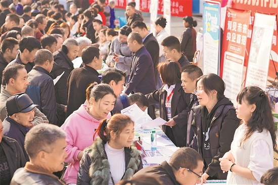 2月18日,贵州省赤水市“2024年‘春风行动’暨东西部劳务协作招聘会”现场人潮涌动。当日,赤水市人社局举办招聘会,通过“线上+线下”搭建返乡人员就业桥梁,帮助群众“淘”出心仪的岗位,实现“家门口就业”。本报通讯员 张鹏 苟炼炜 摄
