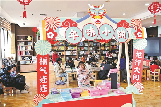 近日,浙江省东阳市新华书店内的“年味小铺”,小读者在家长陪伴下选购和阅读书籍。