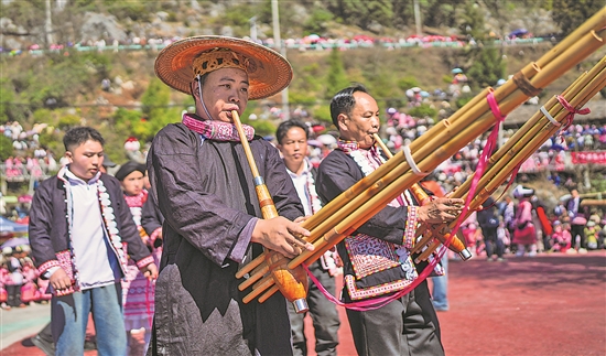 2月19日,苗族群众在贵州省六盘水市六枝特区梭戛苗族彝族回族乡高兴村跳花场吹奏芦笙。当日是农历正月初十,梭戛苗族彝族回族乡苗族跳花节在高兴村跳花场举办。来自周边地区的苗族群众及国内外游客上万人汇聚花场,欢度跳花节。跳花节期间还将举行苗族打鼓、苗族三眼萧、芦笙舞和苗族山歌对唱等活动。新华社记者 陶亮 摄