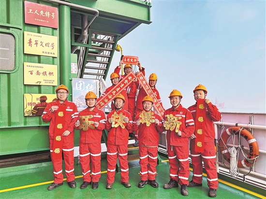 春节期间,中国石化胜利油田埕岛中心三号平台的班组职工坚守生产一线,全力保障节日期间海上油气生产安全平稳运行。图为除夕,埕岛中心三号平台的职工给大家拜年。 张灿 摄