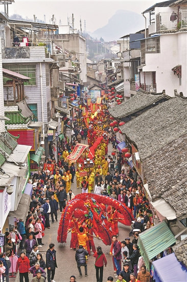2月20日,人们在贵州省石阡县仡佬毛龙节上参加毛龙巡游。