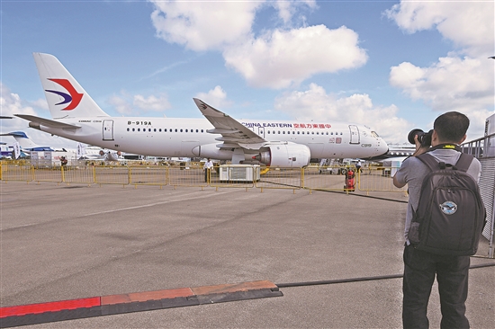 2月20日,一架中国东方航空公司C919客机在新加坡航展上做静态展示。