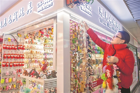 2月21日,义乌国际商贸城经营户整理展示样品。