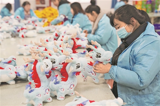 2月20日,安康某动漫文化产业公司的工人在生产车间内加工龙年生肖主题的毛绒玩具。