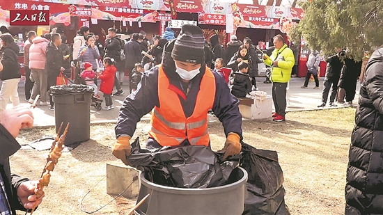 今年春节,北京地坛庙会阔别四年回归,人气爆棚,开幕首日就迎来超13万人次的客流量。为了给游客提供一个干净整洁的游园环境,让大家舒心愉悦地品年味、赏民俗,地坛公园共有105名保洁人员负责清扫,日均清理垃圾超13吨。他们每天早上6点半到岗,等到晚上七八点把所有垃圾清运装车运走后才能休息。(本报记者 曲欣悦)