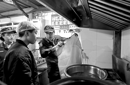 当日,上海市长宁区消防救援支队对辖区内餐饮行业进行消防安全检查,支队消防指导组成员对餐饮店内的消防设施器材、燃气使用、疏散通道、电器线路敷设以及油烟管道内油垢清理情况等进行排查,现场帮扶指导,清除火灾隐患。 新华社记者 方喆 摄
