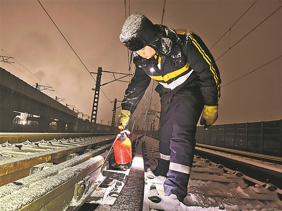图为职工对道岔滑床板进行扫雪除冰作业。 高英皓 摄