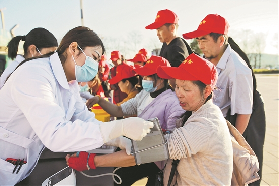 近日,云南曲靖北站站前广场,医护人员为外出务工人员测量血压和提供健康咨询。当日,曲靖市组织春节后农村劳动力转移就业集中欢送仪式,为千余名农民工提供专列“点对点”输出服务。近年来,当地采取“点对点”“一站式”全程保障服务措施,让务工人员实现“出家门、上车门、进厂门”无缝衔接,确保外出务工人员安全、有序返岗。杨俊鹏 摄/视觉中国