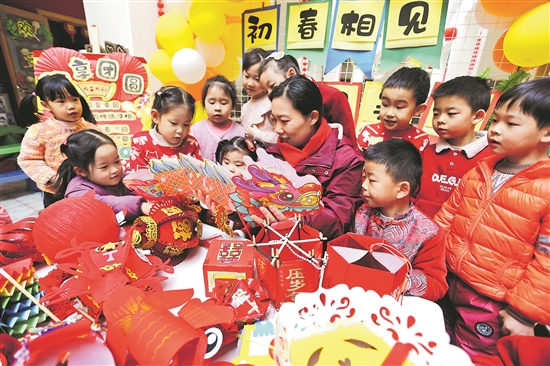 近日,各地举行丰富多彩的活动,喜庆元宵节。图为在江苏省连云港市一家幼儿园,老师指导小朋友制作元宵花灯。新华社发(王春 摄)