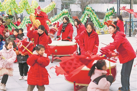 2月25日,浙江长兴县李家巷镇中心幼儿园的孩子们在老师带领下开展开学第一课主题活动,体验舞龙、剪纸,感受非遗传统文化的独特魅力。
