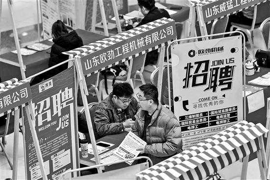 春节过后,各地组织多场招聘活动,助力企业复工复产和求职者就业。图为求职者在山东省青州市举办的新春企业推介暨人才招聘会上了解岗位信息。新华社发(王继林 摄)
