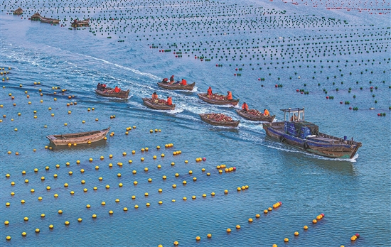 春节刚过,在山东省荣成市的各个海洋牧场里,养殖船来往穿梭,养殖工人紧张作业,一派海上“春耕”的繁忙景象。