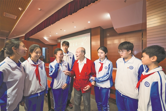 2月26日,在天津市第四中学,91岁的新中国第一代飞行员周修平与学生们交流。