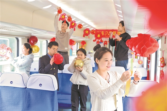 2月23日,为了让旅客感受元宵节日气息,中国铁路郑州局集团有限公司郑州客运段北京一队K180/179次列车工作人员精心装扮车厢。他们自编自演,为旅客准备了歌曲、小品、猜灯谜等文艺节目和游戏。本报通讯员 张建峰 摄