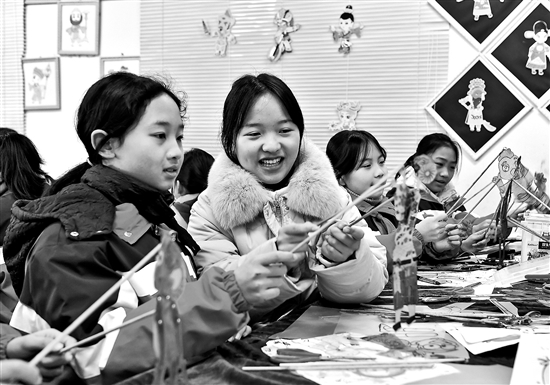 2月26日,四川省广安市前锋区代市小学的学生在老师的指导下学习皮影戏表演技巧。