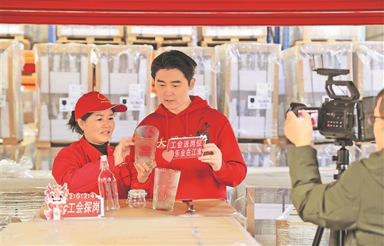 2月28日,安徽省淮北市总工会“入企探岗”直播团队在用工企业直播企业信息。