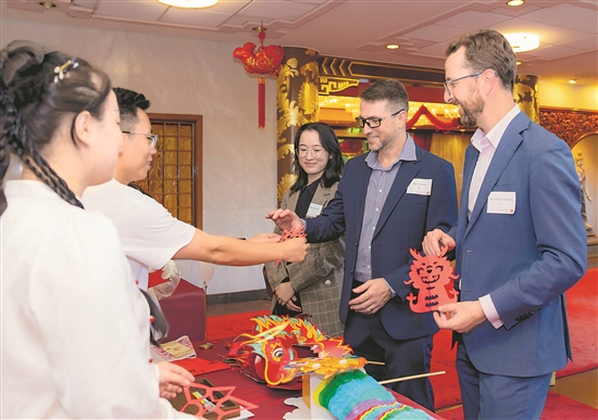 当地时间2月27日,在澳大利亚堪培拉中国驻澳大利亚大使馆,来宾欣赏中国剪纸艺术。新华社发(储晨 摄)