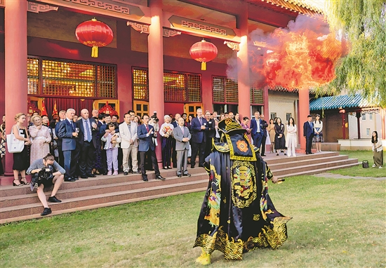 当地时间2月27日,在澳大利亚堪培拉中国驻澳大利亚大使馆,来自西安的艺术家表演喷火。新华社发(储晨 摄)