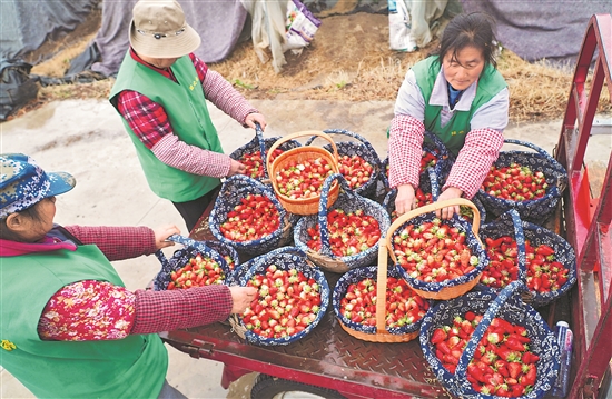 2月29日,在枣庄市薛城区常庄街道吴庄村一处大棚草莓种植园内,员工将刚采摘的草莓装车。