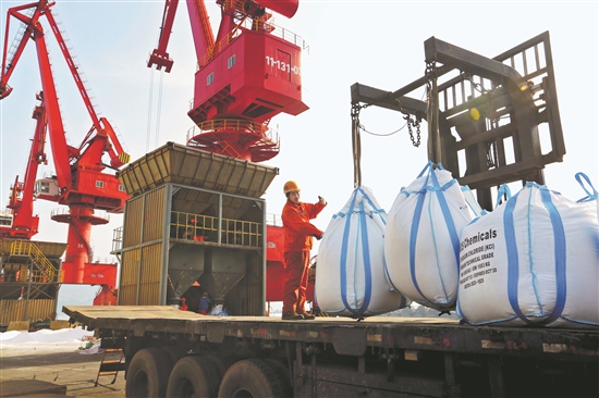 2月27日,在江苏连云港港口码头,工人将卸下的化肥装车。