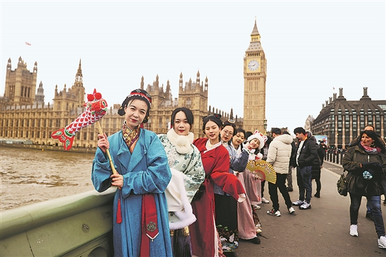 日前,一些汉服爱好者身着汉服来到英国伦敦的泰晤士河畔和大英博物馆,向当地民众和游客介绍中国春节,宣传中华传统文化。图为近日汉服爱好者在英国伦敦大本钟前展示汉服。新华社记者 李颖 摄