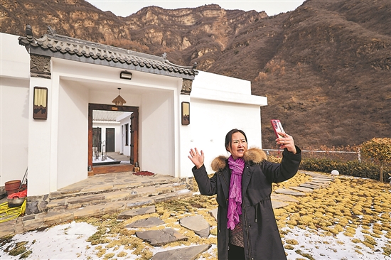 民宿经营者在天津前干涧村的自家民宿前用手机录制短视频进行推介。