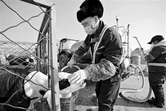 近年来,山东省临沂市沂南县加快推进畜牧业产业集群建设,优化资源配置利用,促进当地群众就业增收。图为工人在一家牧场喂牛犊喝奶。 新华社发(王彦冰 摄)