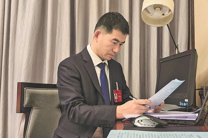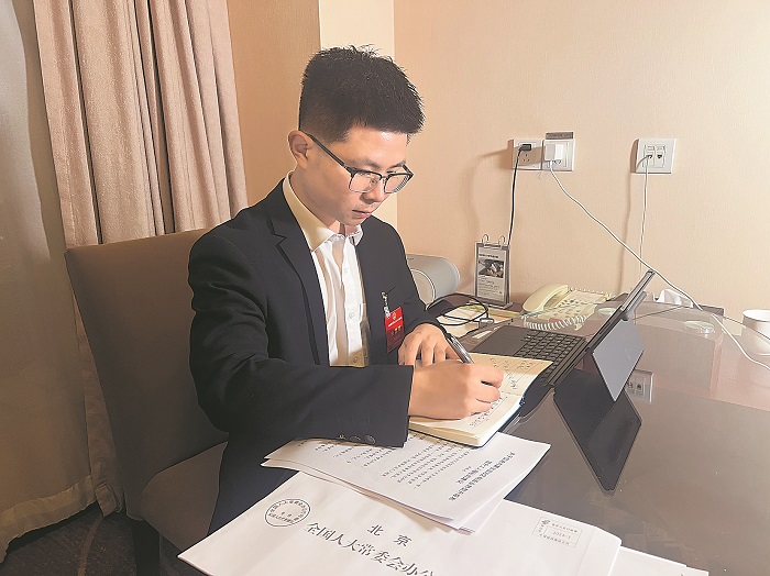 3月4日晚,中铁六局丰桥桥梁有限公司石家庄项目部副经理王足刚代表正在修改自己的建议。今年全国两会上,王足刚代表把关注点放在了智能建造人才培育上。他建议,通过加大校企合作,将先进的智能建造技术带入职业院校。本报记者 王伟伟 摄