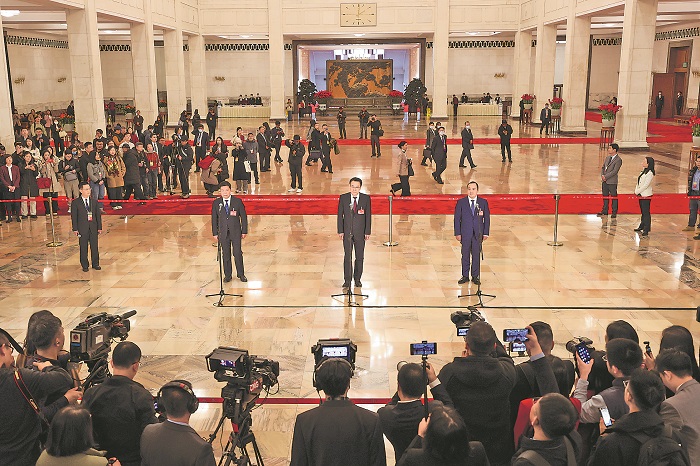 3月4日,全国政协十四届二次会议首场“委员通道”集体采访活动在北京人民大会堂举行。图为全国政协委员韩保江、郭吉安、叶聪(从左至右)接受记者采访。本报记者 吴凡 摄