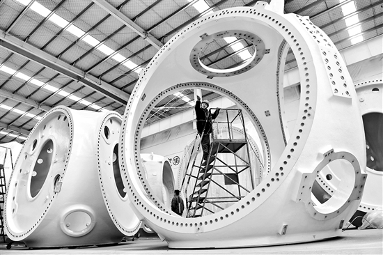 3月1日,在滨州市惠民经济开发区风电装备制造产业园涂装车间,工人在涂装风电轮毂。