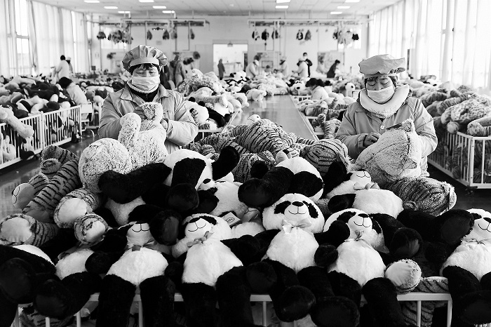 3月2日,江苏连云港,赣榆区石桥镇一家玩具出口企业的工人在缝纫毛绒玩具。