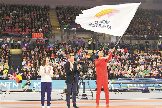 北京时间3月4日,在英国格拉斯哥举行的2024年室内田径世锦赛闭幕。图为中国田径运动员王嘉男(右)在会旗交接仪式上挥舞世界田联旗帜。2025年室内田径世锦赛将在中国南京举行。新华社记者 李颖 摄