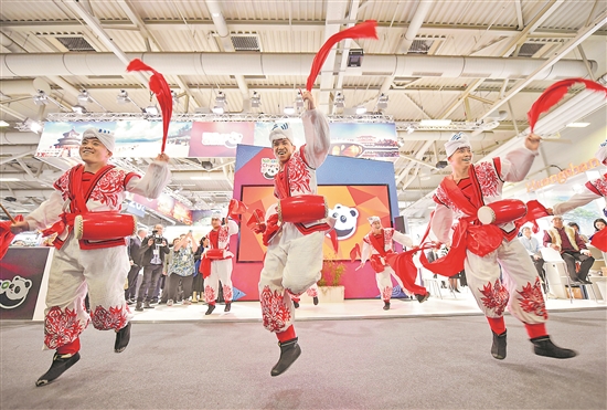 当地时间3月5日,来自中国陕西省的演员在德国柏林举行的柏林国际旅游交易会中国展区表演腰鼓。新华社记者 任鹏飞 摄