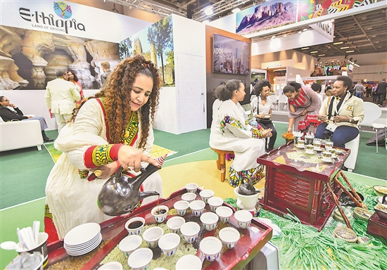 当地时间3月5日,在德国柏林举行的柏林国际旅游交易会埃塞俄比亚展区,工作人员为参观者制作咖啡。新华社记者 任鹏飞 摄