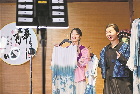 李利(右)在贵州省兴义市万峰林景区门店内与员工一起进行线上销售(2月19日摄)。