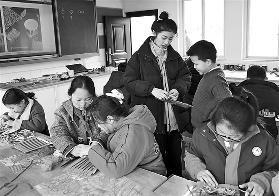 3月5日,志愿者白萱萱教学生们用废旧物品做手工。