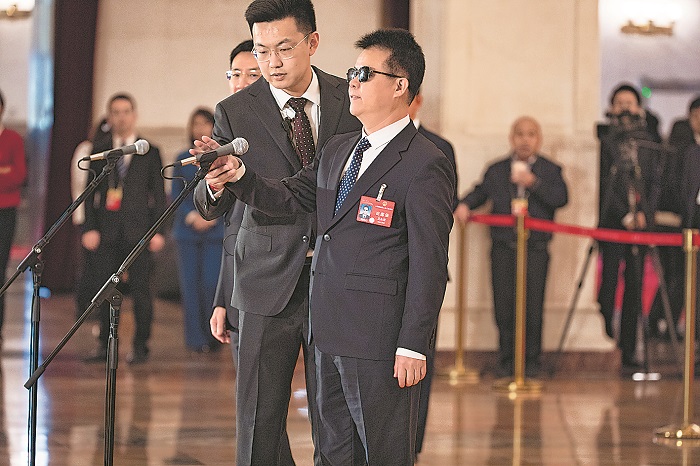 在3月8日十四届全国人大二次会议第二场“代表通道”上,工作人员正在帮助首位盲人全国人大代表、福建省残联兼职副理事长王永澄用手感知话筒的距离。
