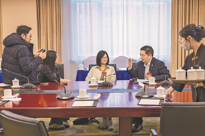 3月8日,在上海代表团小组会议后,东浩兰生集团上海工业商务展览有限公司能源展部经理陈达代表(左三)与中远海运船员管理有限公司上海分公司油运库船长倪迪代表(右二)就复合型人才的培养问题进行交流。
