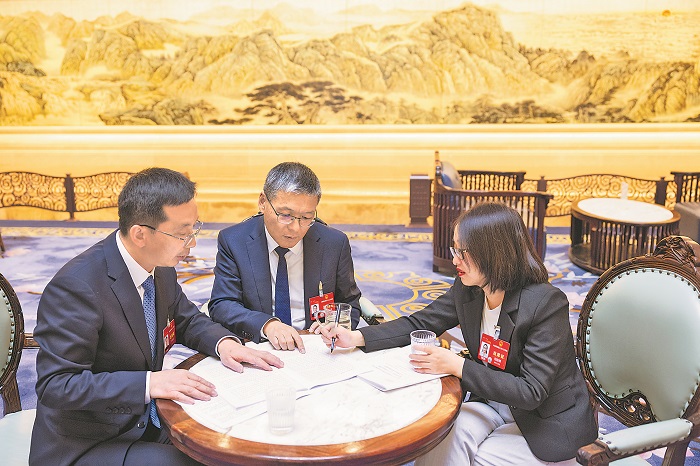 3月9日,在湖南代表团驻地,常德烟草机械有限责任公司高级技师符国强代表、中车株洲所董事长李东林代表、株洲天桥起重机股份有限公司新品事业部部长田际群代表(从左至右)就传统制造业企业如何推动以旧换新展开了讨论。