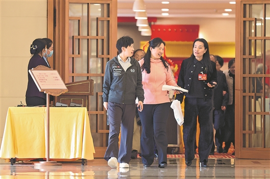 3月10日中午,在北京会议中心驻地,中国兵器工业集团公司首席技师马秀丽委员(右一)和姜妍委员(右二)、张涛委员(左二)在就餐后,一起交流履职经验。