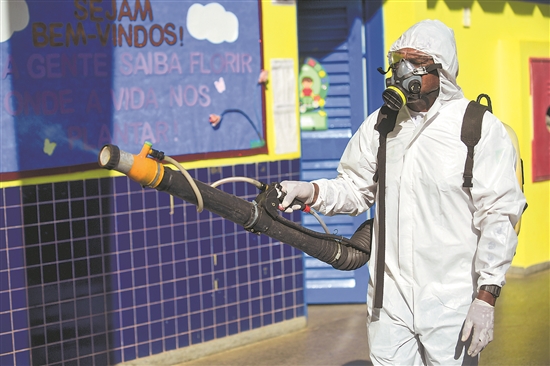 当地时间3月9日,在巴西首都巴西利亚一所学校内,公共卫生人员喷洒灭蚊剂。目前,巴西首都联邦区以及里约热内卢州、阿克雷州等6个州已因登革热暴发宣布进入公共卫生紧急状态。巴西卫生部3月8日更新的数据显示,今年以来,巴西已记录1342086例登革热病例(含疑似病例),其中363例确诊病例死亡。新华社发(卢西奥·塔沃拉 摄)